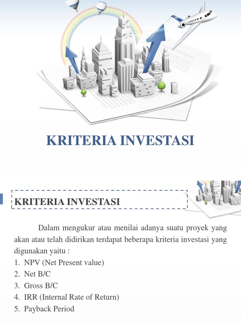 Kriteria investasi kriteria investasi net present value (npv) sering diterjemahkan sebagai nilai bersih sekarang. Menerima atau menolak, memilih satu atau beberapa proyek, atau menetapkan skala prioritas dari proyek yang layak. Makalah kriteria investasi bab i pendahuluan latar belakang investasi pada hakikatnya merupakan penempatan sejumlah dana pada saat ini dengan harapan untuk memperoleh keuntungan dimasa mendatang.